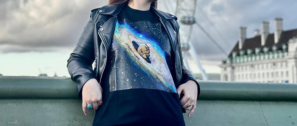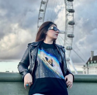 Walking through the eclectic neighborhoods of Shoreditch, Camden, and South Bank, the tee drew attention from curious onlookers and streetwear lovers alike. Its minimalist yet striking design stood out against London’s textured cityscape — an urban contrast that made the cosmic artwork feel even more alive.